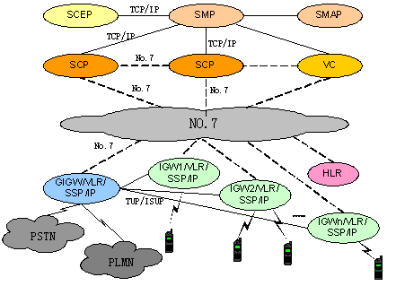 中興PCS智能網(wǎng)可根據(jù)用戶需要采用多種靈活的組網(wǎng)方案,既可全省或多地區(qū)集中建設(shè)一套平臺(tái),充分節(jié)約投資和快速進(jìn)行業(yè)務(wù)提供,又可按地市單獨(dú)建設(shè),充分保證業(yè)務(wù)的靈活性。系統(tǒng)支持與其他PCS網(wǎng)絡(luò)的良好互通,可同時(shí)為其它系統(tǒng)提供PCS智能業(yè)務(wù)。中興PCS智能網(wǎng)基于No.7信令與交換網(wǎng)絡(luò)連接,不占用話路資源,采用嵌入式組網(wǎng),智能業(yè)務(wù)采用簽約信息觸發(fā),SSP(Service Switch Point)和SCP(Service Control Point)之間采用No.7信令進(jìn)行通信,在這種組網(wǎng)方式下,不存在話路迂回,有效節(jié)約運(yùn)營商寶貴的網(wǎng)絡(luò)資源,并可以根據(jù)簽約信息靈活開展多種智能業(yè)務(wù),智能網(wǎng)信令也能很好地支持用戶的移動(dòng)性,給用戶提供更靈活、方便和個(gè)性化的服務(wù)。