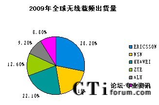 CTI論壇(ctiforum)4月16日消息(記者 潘婷婷): 近日,業(yè)內(nèi)著名調(diào)研公司Infonetics發(fā)布了2009年全球無線通信設(shè)備市場(chǎng)研究報(bào)告《2G/3G Mobile Infrastructure and Subscribers》。根據(jù)報(bào)告顯示,2009年全年,全球無線通信市場(chǎng)份額出現(xiàn)了較大變化,按載頻計(jì),中興通訊全年以12.6%的全球市場(chǎng)份額超越阿爾卡特-朗訊,居行業(yè)第4,按載頻計(jì),2009年全球無線設(shè)備出貨市場(chǎng)份額排名為愛立信、華為、諾基亞-西門子、中興、阿爾卡特-朗訊,分別為28.2%,22.1%,19%,12.6%和9.2%。