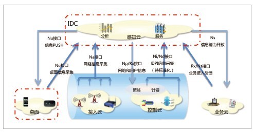 中興通訊增強(qiáng)端到端信息感知和開(kāi)放接口,提出一套標(biāo)準(zhǔn)架構(gòu)如圖2所示,來(lái)實(shí)現(xiàn)整個(gè)網(wǎng)絡(luò)透明、可視。建設(shè)網(wǎng)絡(luò)信息采集體系,增強(qiáng)感知云的端到端分析能力;建立“桌面云-感知云”的云端一體化架構(gòu),提供網(wǎng)絡(luò)推送能力;感知云向終端開(kāi)放網(wǎng)絡(luò)信息和能力,增強(qiáng)用戶感知網(wǎng)絡(luò)、定制個(gè)人體驗(yàn)?zāi)芰;感知云向業(yè)務(wù)開(kāi)放網(wǎng)絡(luò)信息和能力,拓展合作發(fā)展增值業(yè)務(wù)的能力。