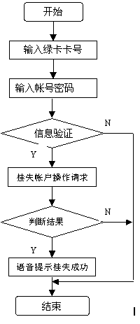 此功能為用戶提供賬號臨時掛失業(yè)務(wù),使用戶的損失減到最小。 用戶通過特定的接入碼進(jìn)入呼叫中心,選擇賬戶掛失后,呼叫中心語音提示用戶輸入帳號密碼,平臺將用戶的數(shù)據(jù)送至金融主機系統(tǒng),然后根據(jù)返回的信息將處理結(jié)果語音提示給用戶。用戶臨時掛失后,還必須到營業(yè)前臺進(jìn)行正式的掛失操作。流程圖如下圖。