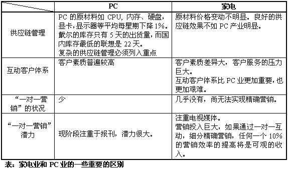 聯(lián)想長(zhǎng)期構(gòu)筑的、在中國(guó)PC制造業(yè)的核心競(jìng)爭(zhēng)力,正受到戴爾的巨大威脅,導(dǎo)致聯(lián)想開始轉(zhuǎn)而采用戴爾的按客戶需求定制、直接銷售的模式,希望建立新的核心競(jìng)爭(zhēng)力,再度引領(lǐng)中國(guó)PC產(chǎn)業(yè)。IT制造業(yè)的巨變,戴爾的成功給陷于低層次競(jìng)爭(zhēng)的家電產(chǎn)業(yè)很大的啟發(fā),曾經(jīng)鑄造中國(guó)家電企業(yè)輝煌的核心競(jìng)爭(zhēng)力急需注入新的生命力,以適應(yīng)新的競(jìng)爭(zhēng)形勢(shì)。計(jì)算機(jī)技術(shù)、互動(dòng)通信技術(shù)的進(jìn)步以及互聯(lián)網(wǎng)的出現(xiàn)使企業(yè)能夠建立與用戶之間一對(duì)一的密切客戶關(guān)系,使服務(wù)創(chuàng)造價(jià)值,IT技術(shù)推動(dòng)技術(shù)、產(chǎn)品、生產(chǎn)、銷售和營(yíng)銷的發(fā)展,支撐家電企業(yè)建立新的核心競(jìng)爭(zhēng)力。在同質(zhì)化競(jìng)爭(zhēng)的環(huán)境下,家電企業(yè)也許更應(yīng)該從服務(wù)、營(yíng)銷、銷售方面來建立自己的核心競(jìng)爭(zhēng)力。海爾就是典型的例子,海爾的發(fā)展與它完善的服務(wù)體系和服務(wù)制度是分不開的。聚焦于服務(wù)、營(yíng)銷、銷售的客戶關(guān)系管理(CRM)系統(tǒng)讓家電企業(yè)看到了新的希望?梢灶A(yù)言,CRM將為家電業(yè)點(diǎn)燃一盞新啟航燈。
