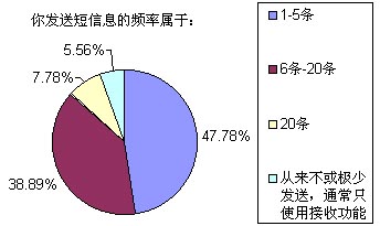 以上選擇中,選擇答案A~E的被訪者比例分別為18.89%、6.67%、25.56%、37.78%和11.11%,也就是說我們這次調(diào)查的重頭是放在一般收入水平和無收入(學生)兩類人群,這兩個人群也正是SMS市場上最活躍的分子。高收入和低收入人群要么因為資金充裕而選擇語音業(yè)務(wù),要么就是因為資金的缺乏而盡量不使用移動通信方式。