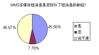 問卷的調(diào)查結(jié)果有些屬于意料之中,有些則暫一定程度上給運營商和終端提供上潑了冷水。不過,有一點是讓提供移動服務(wù)的企業(yè)感到欣慰和滿意的,那就是:最終用戶對MMS的接受程度相當高,除去對資費、操作的質(zhì)疑外,幾乎90%以上的用戶都認為MMS廣泛流行是一個必然的趨勢。下面我們就讀者們廣泛關(guān)注的問題來研究一下。