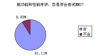 題8的調(diào)查結(jié)果對于中國移動來講絕對是充滿誘惑的,高達91.11%的被訪者表示他們非常愿意嘗試MMS的功能和服務(wù),無疑這對ICP們(MMS服務(wù)的重要載體)也是一針強心劑!