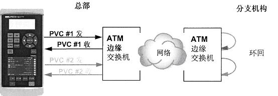 第二,在PVC通道的遠(yuǎn)端設(shè)置物理或虛環(huán)路,這樣單獨(dú)一臺(tái)測(cè)試儀可同時(shí)作為流量的發(fā)送者和接收者(見(jiàn)圖2)。 圖2、環(huán)回測(cè)試設(shè)置,涉及中心局和遠(yuǎn)端局的PVCs端口