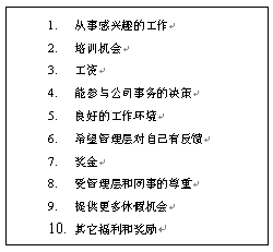 10. 來自公司高層的認(rèn)可。這是一個(gè)非常有效的作法,能得到公司高層的認(rèn)可對(duì)很多人來說,是一生都可以值得回憶的事情。如果在一家全球的大公司,和公司CEO共同進(jìn)餐,得到公司CEO的親筆信,和CEO合影等都是非常高的榮譽(yù)。當(dāng)然,這個(gè)作法不是可以經(jīng)常用的。因?yàn)椋绻玫锰?jīng)常了,就可以失去了一種"神秘感"或"來之不易"的感覺。