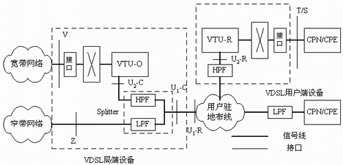、 VTU-R 分別是位于局端和用戶端的VDSL收發(fā)器。業(yè)務分離器(Splitter ,包括HPF和LPF)將同一對電話銅纜上傳輸的VDSL與窄帶業(yè)務(或ADSL)