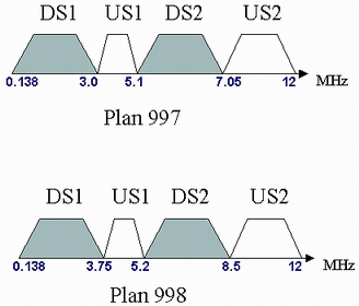 此標準從中國的實際情況出發(fā),既適應接入網絡總體流量的非對稱特性,又考慮滿足一些對上行速率要求較高、接近對稱的業(yè)務需求;既考慮當前技術和設備狀況,又兼顧未來技術發(fā)展和一段時期內可能的業(yè)務需求,提出了中國的VDSL頻段劃分方式。這種方式在Plan998