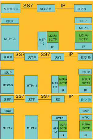 ·信令網(wǎng)關(guān)(SG)終結(jié)MTP2協(xié)議,將MTP2、MTP3之間的原語(yǔ)封裝為M2UA消息,在信令網(wǎng)關(guān)功能和軟交換設(shè)備間傳遞,信令網(wǎng)關(guān)與軟交換分別實(shí)現(xiàn)MTP1/2和3層功能;