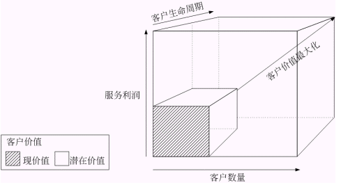 圖二 : 客戶價(jià)值與客戶數(shù)量、服務(wù)利潤(rùn)和客戶生命周期的關(guān)系