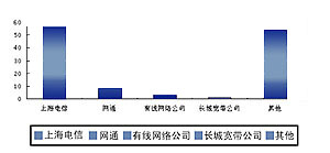 在國內(nèi),視訊市場的形成已經(jīng)初露端倪,眾多商家都開始瞄準(zhǔn)這個新的利潤增長點。2002年8月,上海電信正式將視訊業(yè)務(wù)命名為“新視通”,并陸續(xù)開通了上海至美國洛杉磯、新疆烏魯木齊、石河子、克拉瑪依等地區(qū)的公眾視訊業(yè)務(wù),同時還針對商用客戶和個人用戶啟動了推廣計劃。由于上海是我國的貿(mào)易、金融、經(jīng)濟中心,許多國內(nèi)外的大型企業(yè)都在上海設(shè)有分支機構(gòu),市場潛力不可估量,眾多運營商都在爭取上海的市場。目前,除了上海電信推出的“新視通”業(yè)務(wù)外,網(wǎng)通、有線網(wǎng)絡(luò)和其它公司都在上海推出了自己的視訊系統(tǒng)。根據(jù)我們對企業(yè)用戶的抽樣調(diào)查,下圖的市場占有率表明了視訊業(yè)務(wù)的競爭將會日益激烈。