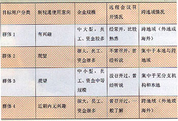 根據(jù)前一階段我們做的視訊業(yè)務(wù)市場研究,目前的主要目標(biāo)客戶可以定位為以下范圍:對于“新視通”會議系統(tǒng)感興趣的客戶,需要觀望的客戶以及雖然不感興趣但企業(yè)規(guī)模較大、存在著一定會議需求卻對遠(yuǎn)程會議不了解的客戶。通過對目標(biāo)群體的進一步細(xì)分,我們將客戶聚類為四個主要群體: