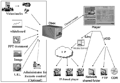 在對市場上現(xiàn)有產(chǎn)品進行了綜合比較后,上海市稅務局決定使用美國Winnov公司的Cbox系統(tǒng)。Cbox是一種視頻采集和控制系統(tǒng),可以支持多種格式文檔,通過URL方式可以提供對未來文檔格式的支持,在操作時只需將文檔提供給Cbox,其余工作由Cbox自動完成; 自動攝像頭控制可預設三個位置,Cbox自動感應,并支持助教、直播、點播等模式,同時具有多種分發(fā)方式,可以存在局域網(wǎng)共享目錄、自動上傳至FTP和刻錄光盤。