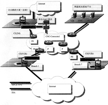 鑒于客戶是通信公司,有較強的系統(tǒng)管理能力,而且要求視訊和數(shù)據(jù)出口分開,視訊出口在北京,可以和VPN線路走相同的物理鏈路,不會造成路由設計上的問題,故將NAT放在客戶公司總部,由用戶自己管理,增加DIA出口和費用。網(wǎng)絡通信拓撲圖如右所示。