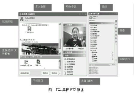 RTX產(chǎn)品支持標(biāo)準(zhǔn)的SIP、H.323 IP電話協(xié)議,并采用高質(zhì)量的QoS技術(shù)保證實(shí)時通信網(wǎng)絡(luò)質(zhì)量,使得TCL集團(tuán)公司的用戶可以與同事之間采用語音或者視頻的面對面的交流(如圖),相當(dāng)于給集團(tuán)公司的任何一位RTX用戶配備了一部集成的視頻和語音電話。目前這項服務(wù)在集團(tuán)公司非常受歡迎,尤其是遠(yuǎn)程的代表處和集團(tuán)總部之間的信息交流更直接、更快捷,在一定程度上取代了電話的功能,大大節(jié)約了通信費(fèi)用。比如,TCL空調(diào)的計劃部每天需要和全國20多個代表處的計劃處進(jìn)行數(shù)據(jù)往來,以前需要電話完成的功能現(xiàn)在通過RTX的即時文字、短信和語音對講完成,大大提高效率,節(jié)省了通信成本。