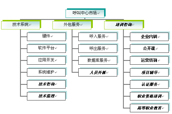 ·從專業(yè)來講,市場將分為客服人員技巧和素質(zhì)培訓(xùn)、管理人員培訓(xùn)、呼入運營管理咨詢、電話營銷管理咨詢、技術(shù)咨詢、客服戰(zhàn)略咨詢等不同層面、不同對象的專業(yè)。市場將出現(xiàn)兩類公司,一類是綜合各個專業(yè)、提供一體化解決方案的公司,另一類是以某個專業(yè)為主營業(yè)務(wù)的公司,如電話營銷技巧專業(yè)培訓(xùn)。