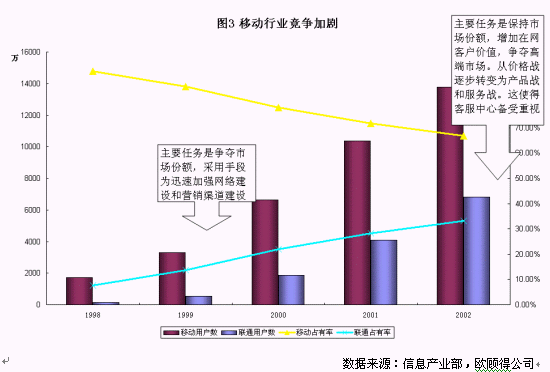 拿移動通訊業(yè)務(wù)來說,如圖3所示,截至到2002年底,中國移動的市場份額大約在65%,而聯(lián)通為35%左右,網(wǎng)絡(luò)覆蓋以及質(zhì)量也越來越趨同。從國內(nèi)國外的經(jīng)驗來看,移動通訊市場的競爭正從爭奪市場份額轉(zhuǎn)變?yōu)楸3质袌龇蓊~和增加客戶價值,而主要手段正也從網(wǎng)絡(luò)建設(shè)、營銷渠道建設(shè)、價格戰(zhàn)等轉(zhuǎn)變?yōu)楫a(chǎn)品戰(zhàn)和服務(wù)戰(zhàn)。在這個階段,兩家主要的運營公司都對客戶服務(wù)非常重視。服務(wù)水平的達標(biāo),投訴流程的梳理,呼叫中心的擴大規(guī)模,電話營業(yè)廳的建設(shè)等工作是今年的重點。