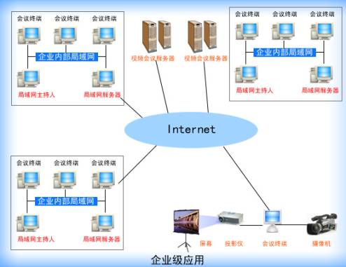 在企業(yè)級別的應用中,企業(yè)將服務器構(gòu)架在公司內(nèi)部,遠程用戶及局域網(wǎng)內(nèi)部的用戶均可登錄服務器,實現(xiàn)交互。企業(yè)級視頻會議系統(tǒng)的應用實際上就是將桌面級視頻會議與會議室級視頻會議系統(tǒng)有機的結(jié)合在一起,客戶端硬件外設可以按照以上的建議,根據(jù)各終端不同的需求進行配置。