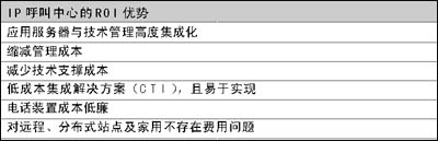 為盡量縮減成本,企業(yè)主管們都在想方設法引入新型通信技術改造呼叫中心。IP呼叫中心的ROI優(yōu)勢在于:應用服務器與技術管理高度集成化;縮減管理成本;減少技術支撐成本;低成本集成解決方案(CTI),且易于實現(xiàn);電話裝置成本低廉;對遠程、分布式站點及家用不存在費用問題。