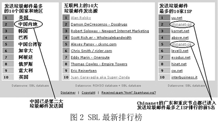 圖2是國(guó)際上著名的反垃圾郵件組織Spamhaus在網(wǎng)站上列出的統(tǒng)計(jì)排行榜,“China”已經(jīng)穩(wěn)居第二大垃圾郵件發(fā)送國(guó)的位置,而右邊的一個(gè)排行榜則從另一個(gè)角度向我國(guó)敲響了警鐘——在專為發(fā)送垃圾郵件的ISP所列的黑名單SBL中,我國(guó)Chinanet的兩個(gè)省級(jí)ISP在前10名中分列第2和第5名。而Chinanet作為中國(guó)的公用信息互聯(lián)網(wǎng)絡(luò),是我國(guó)的Internet骨干網(wǎng),是國(guó)內(nèi)用戶接入互聯(lián)網(wǎng)的主要途徑之一!拔覀冋娌幌M赃@樣的方式‘揚(yáng)名海外’”,來(lái)自一家ISP的一位不肯透露姓名的女士說(shuō),“其實(shí)我們也是受害者!”