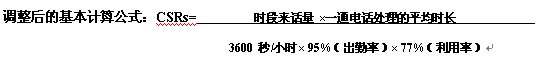 對于任何呼叫中心,由于培訓(xùn)、會議、休息等原因,客戶服務(wù)代表不可能用全部出勤的時間來接聽電話,客戶服務(wù)代表的利用率不可能達到100%,因此,依據(jù)客服中心的行業(yè)標(biāo)準(zhǔn),考慮出勤率和人員利用率;經(jīng)過調(diào)整后計算公式如下: