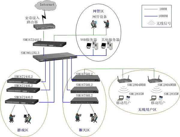 本方案采用"千兆光纖干線,百兆交換到桌面"的設(shè)計(jì)思路,各骨干線路均為1000M。骨干網(wǎng)通過高速線路接入INTERNET,網(wǎng)吧內(nèi)實(shí)現(xiàn)主干千兆交換、百兆到點(diǎn),整個網(wǎng)吧內(nèi)實(shí)現(xiàn)無阻塞通信。根據(jù)顧客的不同消費(fèi)需求,將網(wǎng)吧分為了網(wǎng)絡(luò)游戲區(qū)、聊天區(qū)、貴賓區(qū)等,根據(jù)不同區(qū)域的特點(diǎn),細(xì)化了不同網(wǎng)絡(luò)的解決方案。方案中采用的核心設(shè)備和二層設(shè)備都支持802.1Q標(biāo)準(zhǔn)VLAN和IGMP組播協(xié)議,為VOD、多媒體娛樂等豐富應(yīng)用的開展打下了堅(jiān)實(shí)的基礎(chǔ) 。通過劃分VLAN,MAC地址綁定來劃分了不同類型用戶,很好地滿足網(wǎng)吧的各項(xiàng)業(yè)務(wù)應(yīng)用需求。此外,SMC的豐富無線網(wǎng)絡(luò)產(chǎn)品可以很靈活的滿足網(wǎng)吧的組網(wǎng)需求,投資少、施工快。在提供高性能的同時,還保證很好的安全性,既支持基于802.11b標(biāo)準(zhǔn)的安全機(jī)制,又支持動態(tài)安全鏈路,以及基于802.1x的增強(qiáng)性安全或認(rèn)證功能。