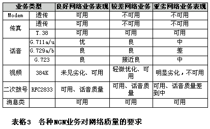 如果不需要支持基于G.711透?jìng)鞣绞絺髡婧蚆odem業(yè)務(wù),承載網(wǎng)質(zhì)量在較差的條件下(網(wǎng)絡(luò)時(shí)延≤100ms,時(shí)延抖動(dòng)≤20ms,丟包率≤1%),話音、視頻、二次撥號(hào)等業(yè)務(wù)質(zhì)量主觀評(píng)價(jià)可到良,基本滿足運(yùn)營(yíng)需要。在承載網(wǎng)質(zhì)量為“惡劣”的條件下,大多數(shù)NGN業(yè)務(wù)達(dá)不到運(yùn)營(yíng)的要求。除了網(wǎng)絡(luò)的QoS指標(biāo)外,為了保證NGN業(yè)務(wù)運(yùn)營(yíng)的需要,要求網(wǎng)絡(luò)具備運(yùn)營(yíng)需要的穩(wěn)定性,在較長(zhǎng)時(shí)間內(nèi)保證網(wǎng)絡(luò)的可用性。在滿足網(wǎng)絡(luò)穩(wěn)定性的必要條件下,承載網(wǎng)質(zhì)量要求不能低于以下指標(biāo)(注:在最低指標(biāo)下透?jìng)鞣绞降膫髡婧蚆odem業(yè)務(wù)不可用):帶寬滿足業(yè)務(wù)規(guī)劃需要;網(wǎng)絡(luò)時(shí)延≤100ms;時(shí)延抖動(dòng)≤20ms;丟包率≤1%。