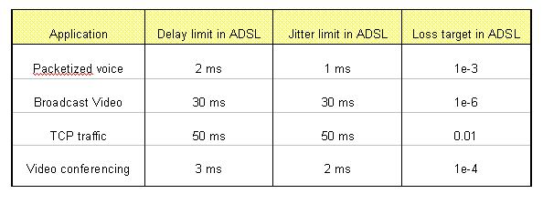 本節(jié)以ADSL承載的幾種典型業(yè)務(wù)為例,討論如何保證不同應(yīng)用的QoS要求。為保證不同應(yīng)用的QoS要求,ADSL設(shè)備可通過對不同的業(yè)務(wù)進(jìn)行分級,以Diffserv的方式提供不同的分級所需的QoS質(zhì)量。例如可將語音業(yè)務(wù)(VoIP)和視頻會議設(shè)為最高優(yōu)先級,廣播視頻業(yè)務(wù)設(shè)為較高優(yōu)先級,其他如Web瀏覽等業(yè)務(wù)設(shè)為低優(yōu)先級。ADSL設(shè)備為每個(gè)優(yōu)先級設(shè)立獨(dú)立的隊(duì)列,然后采用嚴(yán)格優(yōu)先級或帶有權(quán)重的循環(huán)機(jī)制控制各優(yōu)先級隊(duì)列的輸出。通過調(diào)整不同優(yōu)先級隊(duì)列的buffer大小和最長留駐時(shí)間,可滿足不同應(yīng)用對時(shí)延、抖動(dòng)、包丟失率的不同要求。
