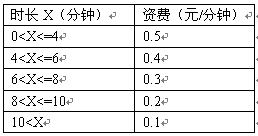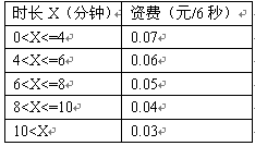 例3,國內(nèi)長途話費(fèi)在時(shí)長不超過4分鐘的情況下,按0.07元/6秒收。怀^4分鐘但不超過6分鐘,統(tǒng)一按0.06元/6秒收取;超過6分鐘但不超過8分鐘,統(tǒng)一按0.05元/6秒收;超過8分鐘但不超過10分鐘,統(tǒng)一按0.04元/6秒收。怀^10分鐘,統(tǒng)一按0.03元/6秒收取。