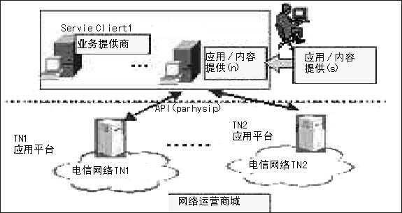 這種模式是指應用服務器的兩部分應用平臺和業(yè)務提供分別由傳統(tǒng)電信運營商和AP控制。應用平臺在運營商域內由運營商進行控制,而AP或者CP(Content provider)可以與傳統(tǒng)電信運營商簽約來提供業(yè)務,業(yè)務與應用提供通過開放的API由第三方提供。