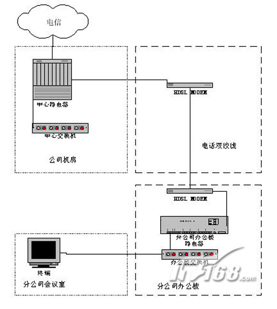 MODEM,就可以實(shí)現(xiàn)用戶(hù)到電信骨干網(wǎng)的網(wǎng)絡(luò)接入。網(wǎng)絡(luò)中心機(jī)房的HDSL MODEM通過(guò)V.35線纜直接接入到網(wǎng)絡(luò)中心的路由器上,用戶(hù)的HDSL