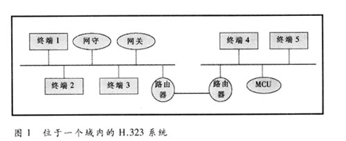 一個簡單的基于H.323的視訊會議系統(tǒng)包括網(wǎng)守(GK)、網(wǎng)關(GW)、多點控制單元(MCU)和所有終端的集合。圖1是在常見的一種域類型中的H.323系統(tǒng)。