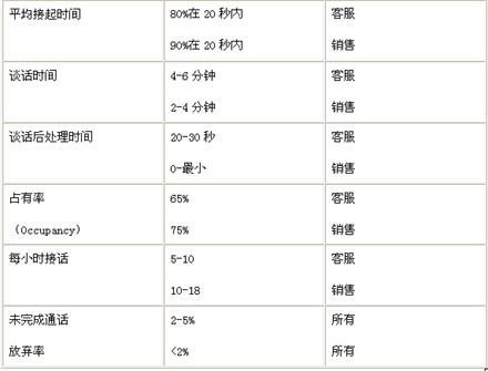 呼叫中心管理需要大量的量化指標。這些指標應當參照別人的經驗,但絕對沒有拿來就用的“基本標準”。常用的有以下一些: