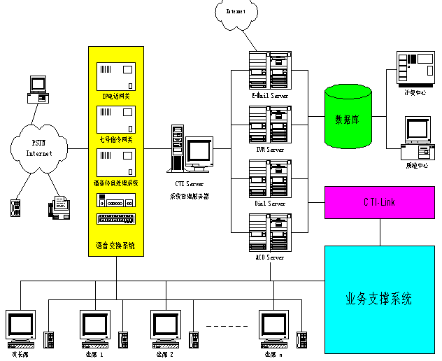 所述的電子郵件服務(wù)器(7)、交互式語音管理服務(wù)器(8)、撥號服務(wù)器(9)以及用于平均分配話務(wù)的語音系統(tǒng)分配服務(wù)器(10)均位于所述系統(tǒng)管理服務(wù)器(6)與數(shù)據(jù)庫(12)之間。所述的四個服務(wù)器(7~10)通過一個CTI業(yè)務(wù)接口(15)與業(yè)務(wù)支撐系統(tǒng)(16)連接。