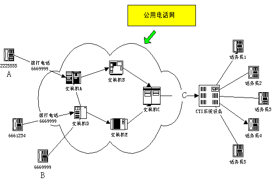 - CTI系統(tǒng)的將以企業(yè)(B)的名義對客戶(A)進(jìn)行接續(xù)服務(wù),該服務(wù)可以是語音服務(wù),傳真服務(wù),人工服務(wù),可以是客戶定制的語音系統(tǒng),傳真服務(wù)系統(tǒng),會議系統(tǒng),技術(shù)支持系統(tǒng)等等。