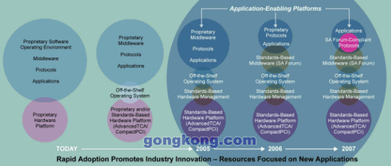 計算機(jī)和通信業(yè)已經(jīng)堅定的向開放標(biāo)準(zhǔn)演進(jìn)。例如,Linux已經(jīng)被作為OS大量采用,計算模塊已經(jīng)遵循各種規(guī)范標(biāo)準(zhǔn)來設(shè)計,具有標(biāo)準(zhǔn)接口,如CPCI和ATCA。如果TEM繼續(xù)采用目前的方法集成計算機(jī)硬件和軟件模塊,全面標(biāo)準(zhǔn)化將是一個緩慢延進(jìn)的過程。下一步將是基于標(biāo)準(zhǔn)的硬件平臺管理,最終可能在本年代末,遵循SAF的中間件及其上運行的應(yīng)用。