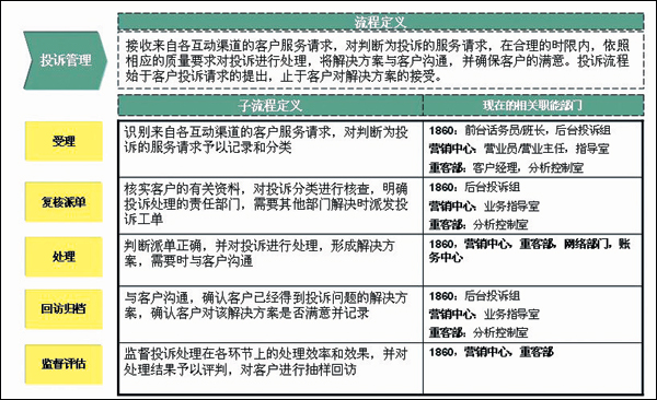 通過分析當前服務流程發(fā)現(xiàn)存在的問題,確立了以下需要進行針對性優(yōu)化的環(huán)節(jié): 適當授權(quán)加快高價值客戶投訴處理速度,體現(xiàn)差異化; 增加派單過程的透明性,使客戶更清楚地了解整個投訴的處理進程;