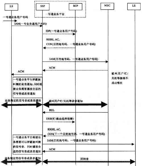 基于目前現(xiàn)網(wǎng)的信令處理方式,當一號通業(yè)務用戶所設定的目的地號碼為移動用戶時,如果出現(xiàn)被叫用戶忙、關機等接續(xù)不成功情況,現(xiàn)有的移動交換機會給主叫用戶播放錄音通知,通知用戶,如果主叫用戶不掛機,則在通知播放完畢后向前端交換機后向返回REL消息,釋放呼叫。一號通業(yè)務平臺收到釋放消息后根據(jù)業(yè)務需要,進行下次接續(xù)。如果按照原有的信令流程,主叫用戶會先聽到被叫用戶忙或關機的錄音通知,然后又聽到下一個呼叫的回鈴音。為了避免出現(xiàn)這種現(xiàn)象,一號通業(yè)務平臺要能夠屏蔽被叫側(cè)播放的錄音通知和信號音,并根據(jù)業(yè)務需要向主叫用戶播放合適的信號音或錄音通知,具體的屏蔽方式由一號通平臺自行確定。以智能網(wǎng)實現(xiàn)、ISUP消息為例,具體的消息流程如圖3所示。
