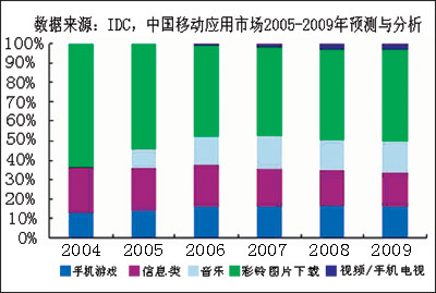 與此同時,中國移動增值電信業(yè)務占移動運營商的業(yè)務收入比重不斷增加,根據(jù)IDC統(tǒng)計,2004年中國移動增值服務市場的個人應用市場達到340億元人民幣,該市場在2009年將達到880億元人民幣,其2004年~2009年復合年平均增長率為15.3%。