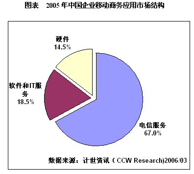 目前,我國移動商務(wù)市場仍處于萌芽期,根據(jù)計(jì)世資訊(CCW Research)《2005-2006中國移動商務(wù)應(yīng)用發(fā)展趨勢研究報告》數(shù)據(jù),2005年中國企業(yè)移動商務(wù)應(yīng)用市場規(guī)模為112.5億元,其中硬件投資為16.3億元,軟件與IT服務(wù)投資為20.8億元,電信服務(wù)投資達(dá)到75.4億元,占有整體市場的67.0%。