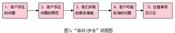 從上圖,我們可以看出,影響服務(wù)質(zhì)量主要有A、B兩個關(guān)鍵控制點,決定A點服務(wù)質(zhì)量的主要是排班流程,它影響客戶接入的速度和客戶的等待時間,即決定了10086的接通率;決定B點服務(wù)質(zhì)量的主要是培訓(xùn)流程,它直接影響服務(wù)人員的業(yè)務(wù)知識和服務(wù)能力,從而影響服務(wù)質(zhì)量。由此,我們優(yōu)化了排班流程、新建了客服代表的培訓(xùn)流程,有效地保證了上述關(guān)鍵環(huán)節(jié)的服務(wù)質(zhì)量。排班流程優(yōu)化的具體方法在筆者的前一篇文章《流程與組織能力》中已經(jīng)作了詳細(xì)的介紹,下面結(jié)合實際來介紹我們新的培訓(xùn)流程-“培訓(xùn)五步法”。