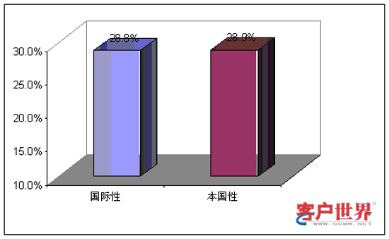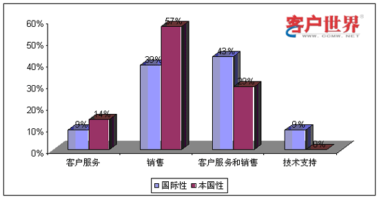 從業(yè)務(wù)功能看來,國際性呼叫中心和本國性呼叫中心承擔(dān)著不同的角色。9%的國際性呼叫中心和14%的本國性呼叫中心提供僅限于客戶服務(wù),例如賬號(hào)查詢和催費(fèi)收款。39%的國際性呼叫中心和59%的本國性呼叫中心專門展開網(wǎng)上營(yíng)銷和銷售(外撥為主)。43%的國際性呼叫中心和29%的本國性呼叫中心同時(shí)承擔(dān)客戶服務(wù)和銷售功能。最后,我們調(diào)查到9%的國際性呼叫中心專門從事技術(shù)支持,而且這些中心專門為國際市場(chǎng)設(shè)立。服務(wù)功能上的差異會(huì)對(duì)商業(yè)定位和人力資源管理提出不同的要求。