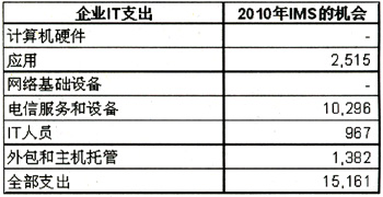 在企業(yè)市場,運營商將獲得重要的收入機會。IMS是運營商從網(wǎng)絡(luò)級IT應(yīng)用、主機數(shù)據(jù)中心服務(wù)和專業(yè)服務(wù)上獲得收入的希望。到2010年IMS有機會為美國運營商產(chǎn)生超過150億美元的年收入。雖然不能完全保證這個規(guī)模的收入貢獻,但是任何運營商都不會輕易錯過這個巨大的潛在市場機會。