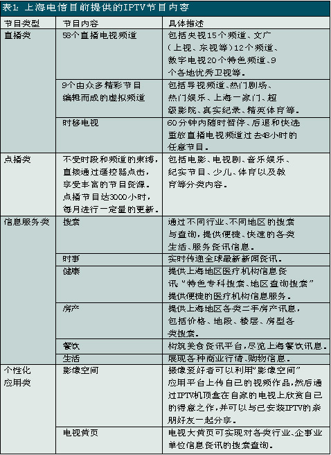 上海電信是國(guó)內(nèi)關(guān)注并切入IPTV業(yè)務(wù)較早的電信運(yùn)營(yíng)商之一,自2005年就開(kāi)始積極測(cè)試和試驗(yàn)。此次上海電信在全上海市范圍內(nèi)推出IPTV業(yè)務(wù),被業(yè)界看作是“中國(guó)IPTV規(guī)模商用的新紀(jì)元”。除了影視節(jié)目收看、視頻內(nèi)容點(diǎn)播、時(shí)移功能外,上海電信的IPTV服務(wù)還包括時(shí)事新聞、遠(yuǎn)程醫(yī)療、視頻房產(chǎn)信息、餐飲信息、天氣預(yù)報(bào)、票務(wù)查詢等信息服務(wù)以及可視電話、IPTV游戲等個(gè)性化應(yīng)用。其中IPTV的直播頻道有58個(gè),視頻點(diǎn)播可選節(jié)目量達(dá)3000小時(shí)以上。另外,上海電信還推出了影像空間和電視大黃頁(yè)等應(yīng)用服務(wù),攝像愛(ài)好者可以利用“影像空間”應(yīng)用平臺(tái)上傳自己的視頻作品,然后通過(guò)IPTV機(jī)頂盒在自家的電視上欣賞自己的得意之作,并可以與已安裝IPTV的親朋好友一起分享;電視大黃頁(yè)可實(shí)現(xiàn)對(duì)各類行業(yè)、企事業(yè)單位信息資訊的搜索查詢。