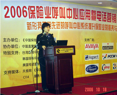 。。2006年10月18日,2006保險(xiǎn)業(yè)呼叫中心應(yīng)用暨電話營(yíng)銷高峰研討會(huì)在北京天鴻科園大酒店隆重召開(kāi),以下是K1主題演講實(shí)錄:
