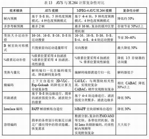 表13對AVS與H.264的計算實現(xiàn)復(fù)雜性進(jìn)行扼要對比,大致估算,AVS解碼復(fù)雜度相當(dāng)于H.264的30%,AVS編碼復(fù)雜度相當(dāng)于H.264的70%。