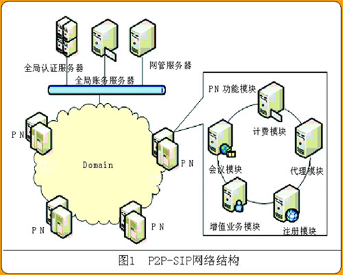 PN在地理上散布各處,邏輯上根據(jù)選用的P2P機(jī)制的不同可以是環(huán)形的(Chord協(xié)議)、矩陣的(CAN協(xié)議)、網(wǎng)狀的(Pastry協(xié)議和Tapestry協(xié)議)。基本的PN至少包括注冊(cè)和代理兩種功能。為進(jìn)行商業(yè)運(yùn)營(yíng),可以部署全局認(rèn)證服務(wù)器、全局賬務(wù)服務(wù)器和網(wǎng)管服務(wù)器等等,用于管理全部的用戶(hù)和所有的PN。