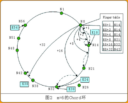 這種查詢(xún)機(jī)制只要求節(jié)點(diǎn)知道順時(shí)針?lè)较蛏献约汉竺婺莻(gè)節(jié)點(diǎn)的位置(自己的successor),查詢(xún)效率低,花費(fèi)的平均時(shí)間是函數(shù)O(N/2)的值,N是Chord環(huán)的實(shí)際節(jié)點(diǎn)數(shù)。為提高查詢(xún)效率,Chord中每個(gè)節(jié)點(diǎn)除了記錄successor和predecessor(順時(shí)針?lè)较蛏献约呵懊娴哪莻(gè)節(jié)點(diǎn))外,還要記錄m個(gè)其他節(jié)點(diǎn)。這m個(gè)節(jié)點(diǎn)由successor(n+2i-1)確定,其中n是本節(jié)點(diǎn)的哈希值,i是1到m間的整數(shù)。m個(gè)節(jié)點(diǎn)的集合就是finger表(圖2中給出N8的finger表)。這種方式下查詢(xún)資源花費(fèi)的平均時(shí)間為O(logN)。