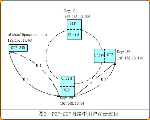 在本例中,SIP URI是michael@powercn.com,假定其哈希值是17,PN的Chord層會(huì)查找到負(fù)責(zé)處理該請(qǐng)求的PN Key值是32,find_responsible_pn(user)返回該P(yáng)N的“IP地址∶端口”——192.168.13.110:5060。PN的SIP層比較該值發(fā)現(xiàn)不是自己,就將注冊(cè)請(qǐng)求轉(zhuǎn)發(fā)到該“IP地址∶端口”,如圖3中M2所示。