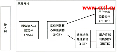 家庭網(wǎng)絡(luò)的參考模型如圖1所示。家庭網(wǎng)絡(luò)內(nèi)部的邏輯功能實(shí)體有4個(gè),包括: